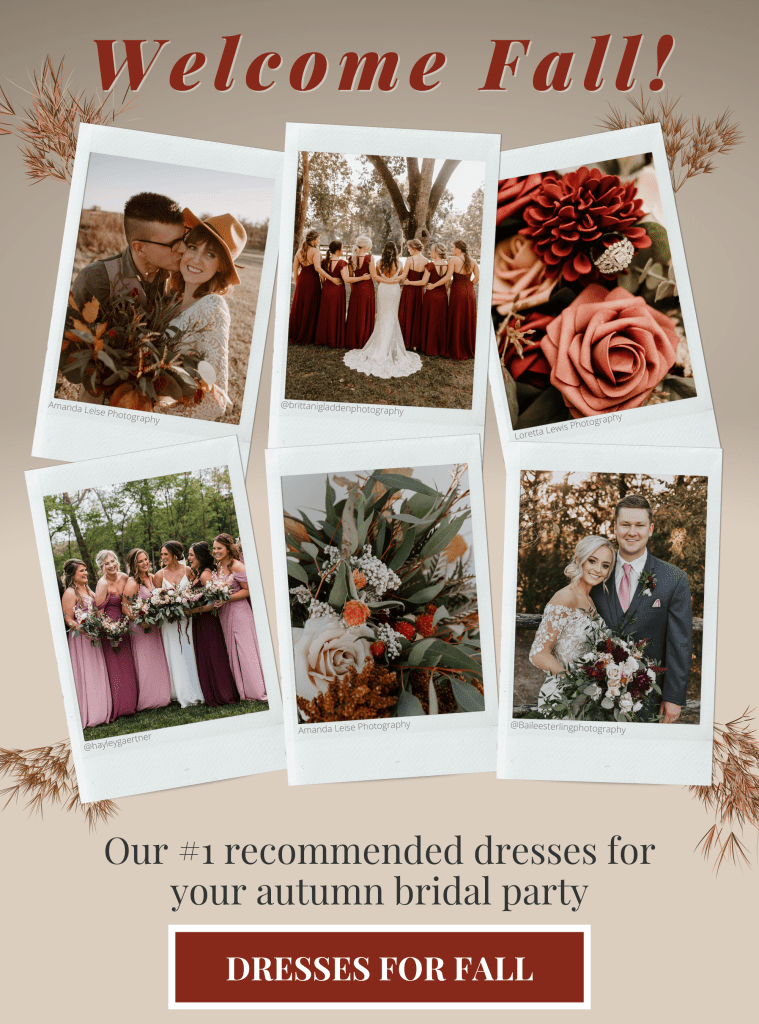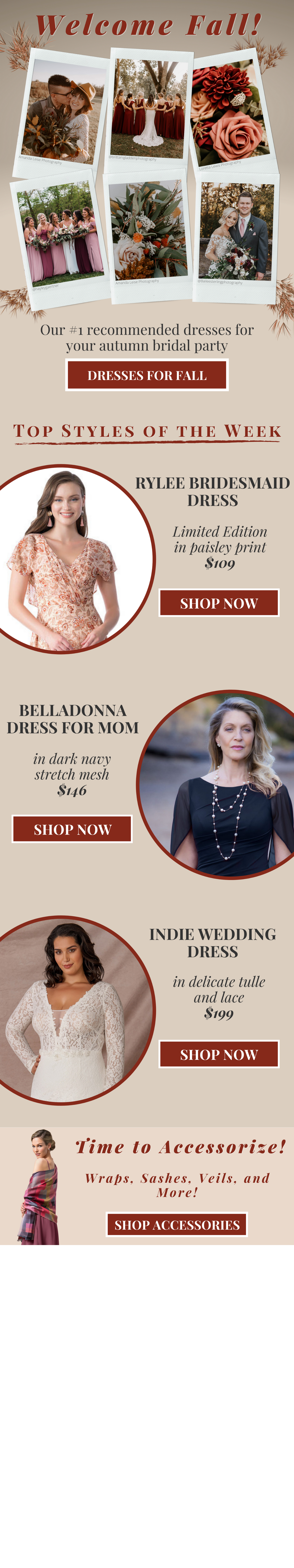 To capture the attention of customers, I used polaroid-style picture frames that highlight wedding images from real brides and bridesmaids. Each of the company’s best sellers is then featured in a circular frame along with the name, price, and compelling copy beside it. I chose the colors and background design to reflect the fall season.