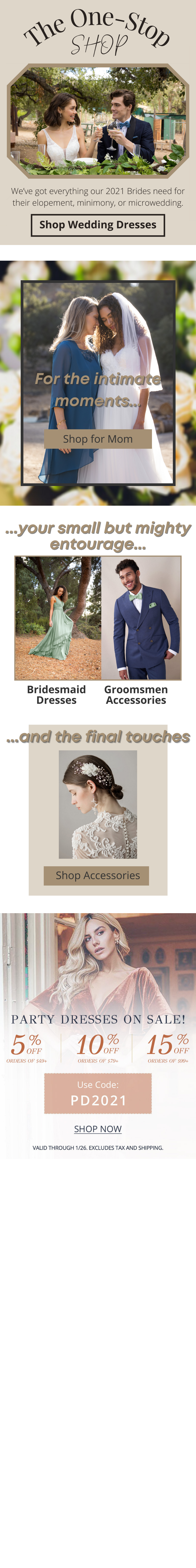 This email, sent at the height of the COVID quarantine, features a full range of product categories for small, intimate weddings. I used a variety of frame shapes and styles for the different images to enhance the design. Note how the copy acts as one continuing sentence spread across each segment of the email as you scroll through.