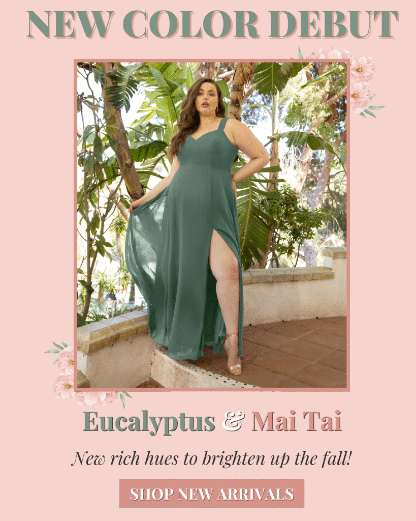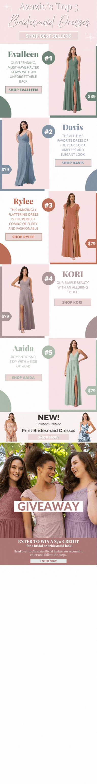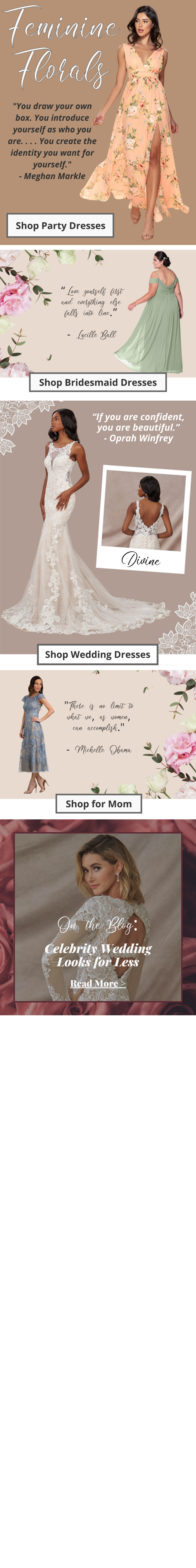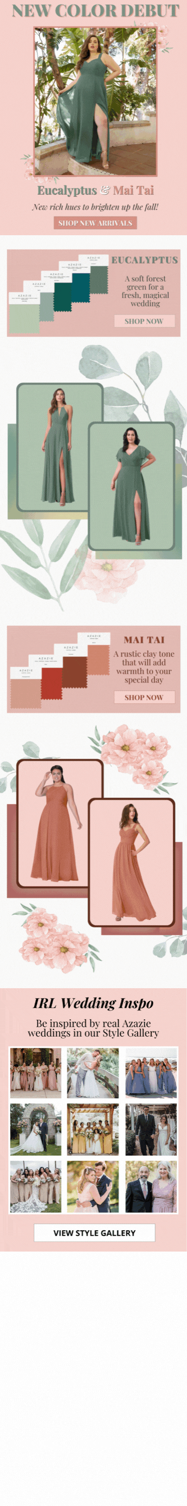 Here I used a combination of editorial images, product images, and swatch palettes to showcase two new dress colors that launched in the month of July. GIFs were added to feature a variety of the most popular styles and sizes. I also created a floral and leaf background to reflect the overall vibe of the new colors. Note the banner at the bottom which drives customers to the Style Gallery (a page that I maintain on the company website), where images of real weddings can be viewed.