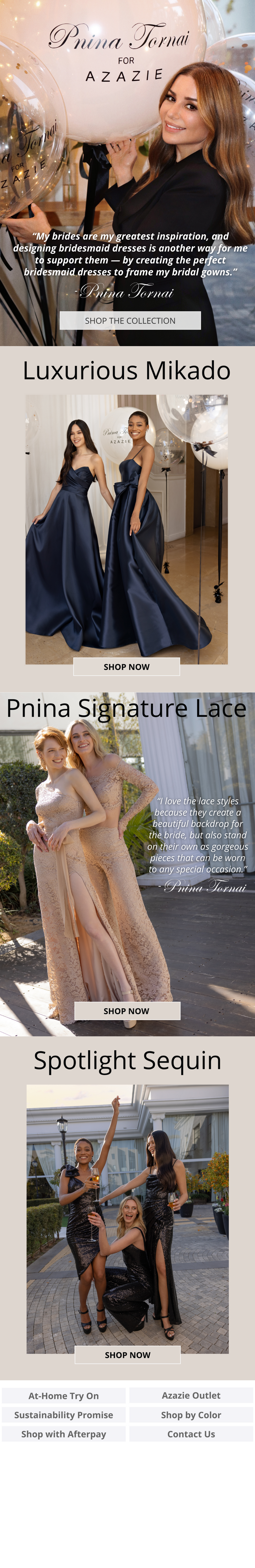 The company partnered with globally known dress designer, Pnina Tornai, and I was asked to create several emails promoting her new collection. In the example shown here, I chose to emphasize the variety of luxurious fabrics using editorial images provided by the designer. I also included personal quotes from the designer herself to highlight the high quality and inspiration for her new product line.